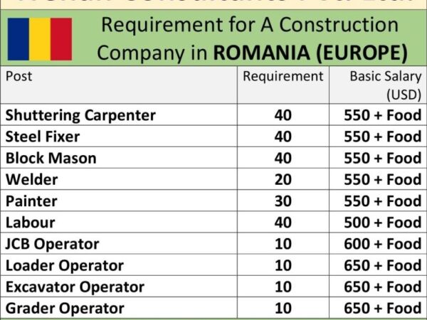 Europe Romania Job requirement for a construction company for shuttering carpenter steel fixer block mason welder labour jcb operator loader operator excavator operator graderoperator.