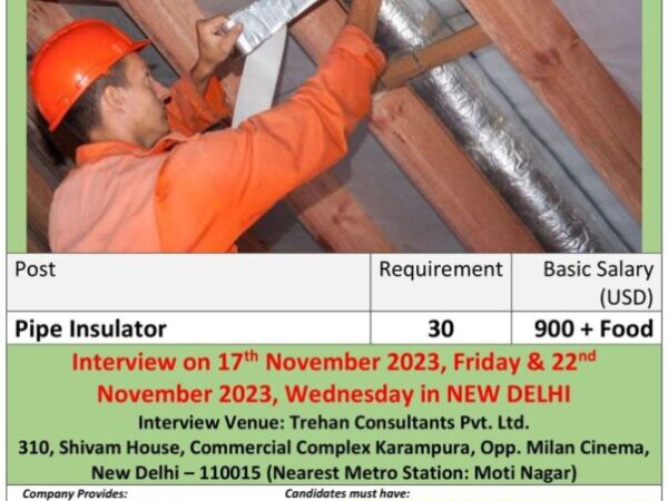 Pipe Insulator Job Vacancy for Romania Europe for a construction company interview at Delhi Document required introductory working video of 3-4 miniates CV/Biodata. Original Passport, …