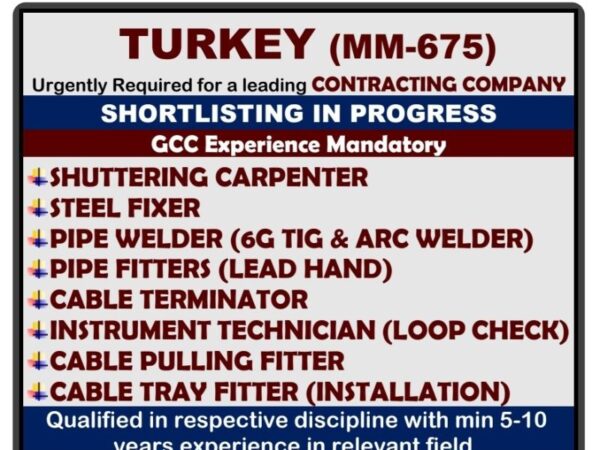 Turkey Job Vacancy for Indian in Asiapower office in Mumbai for Shuttering carpenter steel fixer pipe welder pipe fitter cable terminator instrument technician cable pulling …