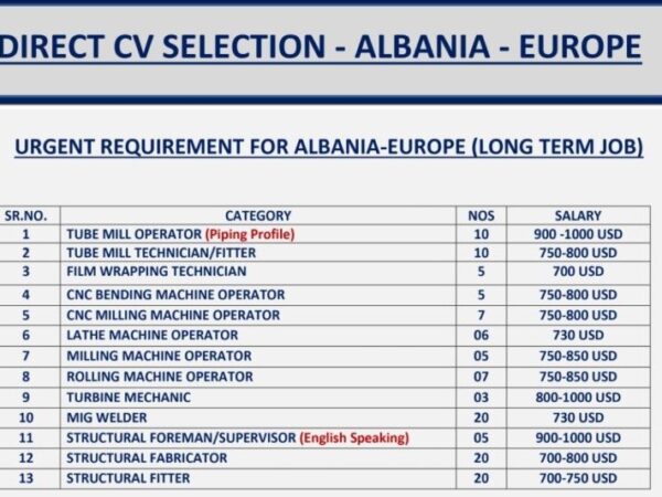 Direct CV Selection Job for Europe Albania in international overseas resources office in Mumbai for Tube mill operator, Tube mill technician/fitter, film wrapping technician, CNN …