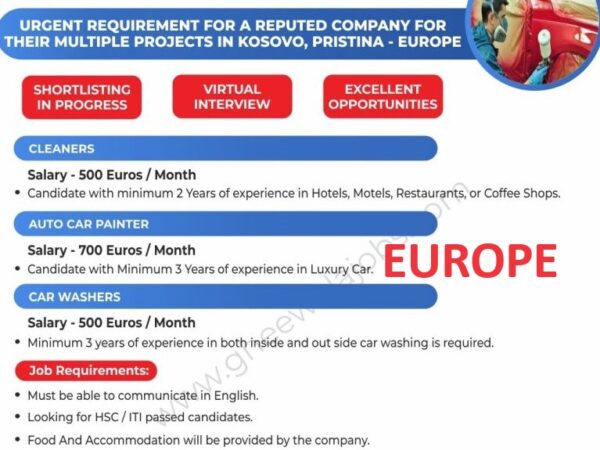 Europe Job Vacancy for Indian Worker in F Gheewala office for cleaner, auto car painter and car washer, Urgent Requirement for a reputed company for …