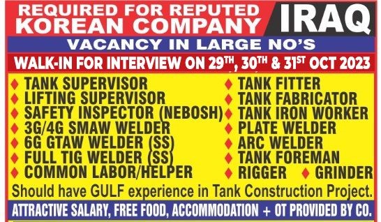 Iraq Job Vacancy for Indian in Asmacs office Mumbai for Tank supervisor, Tank fitter, Lifting Supervisor, Tank fabricator, Safety inspector, Welders, Helper, Tank foreman, Rigger, …