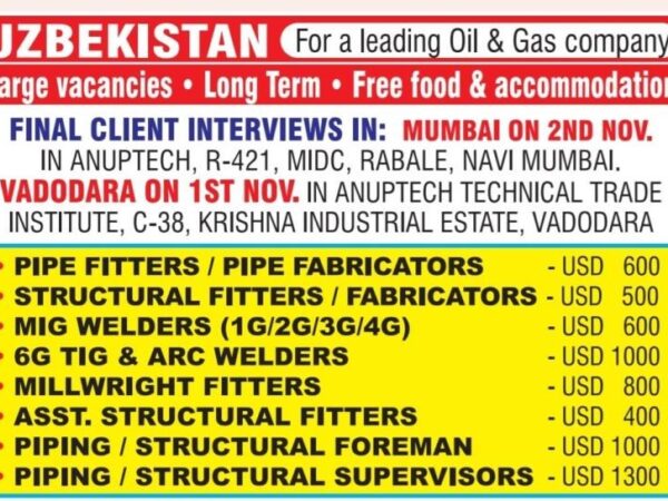 Gulf job requirement Uzbekistan Job Vacancy for Indian in Ambe international office for Pipe fitter, Pipe fabricator, Welder, Assistant Structural fitter, Piping Structural Foreman, Piping …