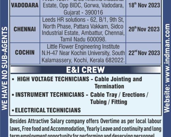 Free Recruitment Jobs in Abu Dhabi for Indians worker Indman consultants office in Mumbai they hiring for E&I Crew high voltage technicians cable jointing and …