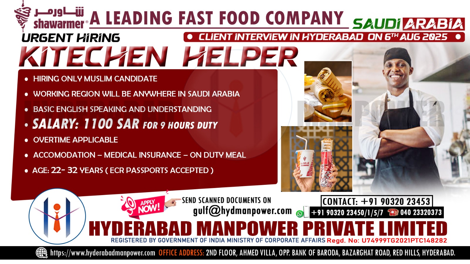 Free Food, Accommodation, Transportation and Medical Insurance Contact now Email: gulf@hydmanpower.com | +91 90320 23453