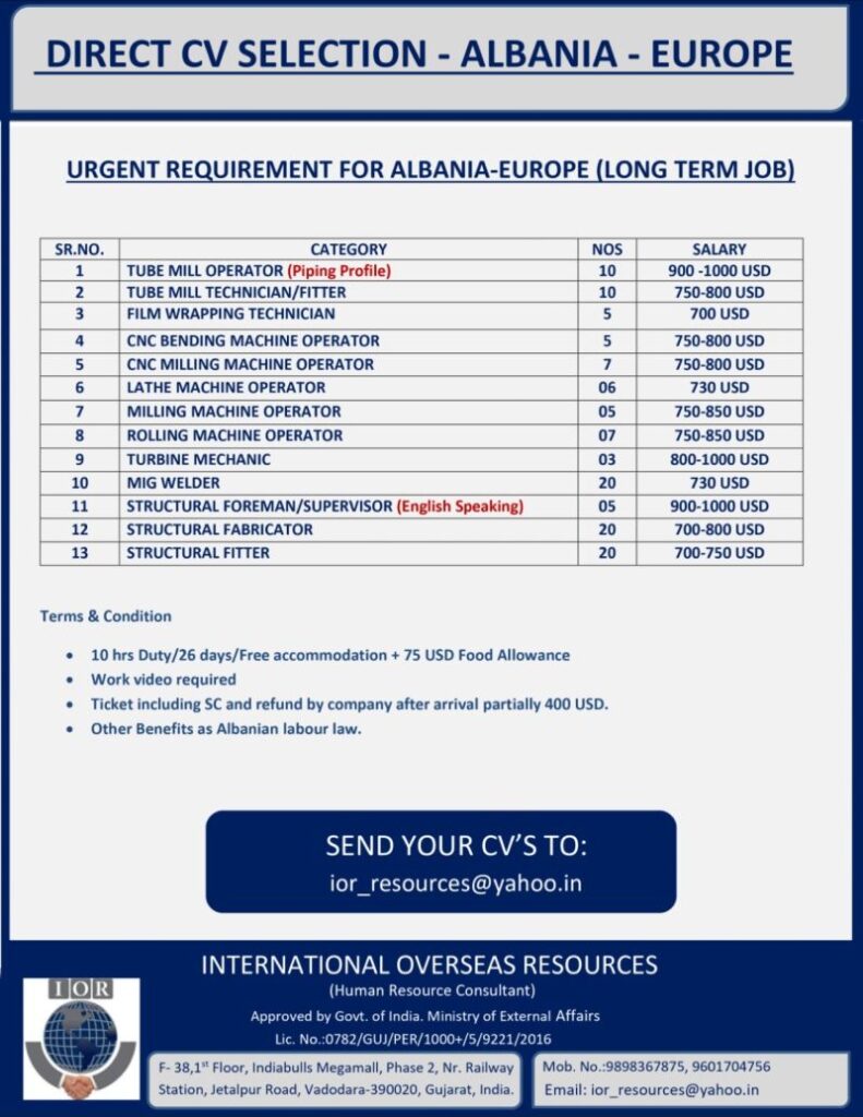 Direct CV Selection Job for Europe Albania in international overseas resources office in Mumbai for Tube mill operator, Tube mill technician/fitter, film wrapping technician, CNN bending machine operator, CNC Milling machine operator, Lathe machine operator, Milling machine operator, Rolling machine operator, Turbine mechanic, Mig welder, Structural foreman/supervisor, Structural fabricator, Structural fitter, long term job urgent requirement 10Hrs duty/26days/free accommodation + 75 USD food allowance work video required ticket including service charge and refund by company after arrival partially 400 USD other benefits as Albania Laboure law send your cv to ior_resources@yahoo.in