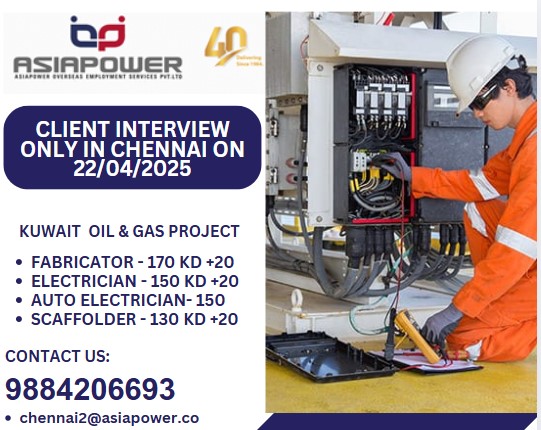 Gulf JobFACE TO FACE INTERVIEW @ CHENNA ON 22/04/2025 Dear All, FACE TO FACE INTERVIEW @ CHENNAI ON 22/04/2025 chennai2@asiapower.co / 9884206693 Share
