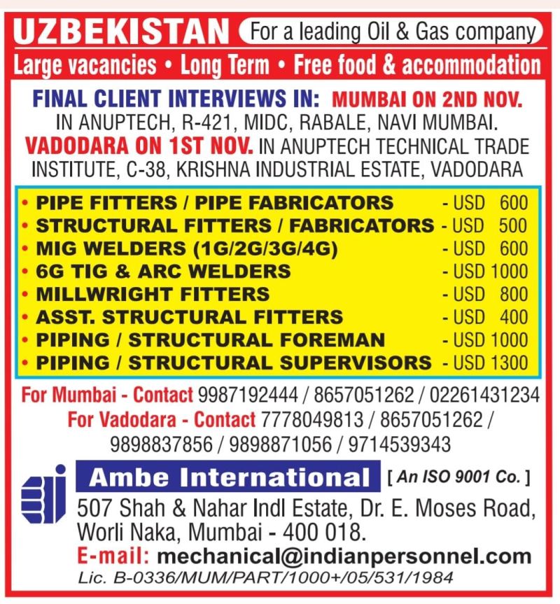 Uzbekistan Job Vacancy for Indian in Ambe international office for Pipe fitter, Pipe fabricator, Welder, Assistant Structural fitter, Piping Structural Foreman, Piping Structural Supervisor.