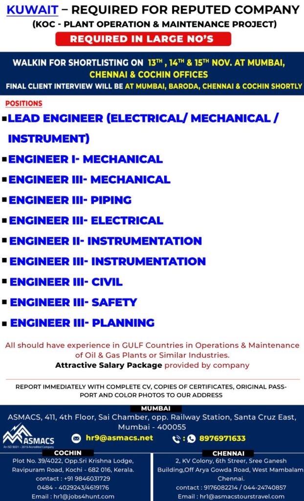 Gulf job Vacancy for Kuwait KOC plant and more required in large no’s walk-in shortlisting final client interview will be at Mumbai Baroda Chennai and cochin shortly