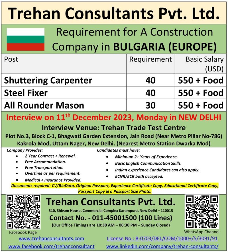 Job Vacancy for Bulgaria Europe Apply Now requirement for a construction company in Bulgaria for shuttering carpenter steel fixer all rounder mason job vacancy in ND enterprises office.