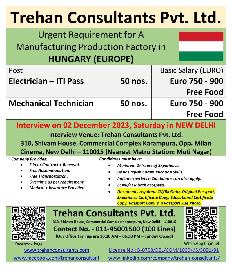 Job Vacancy for Hungary Europe Apply Now for Electrician ITI pass mechanical technician urgent requirement for manufacturing factory in Hungary job vacancy in ND Enterprises office.