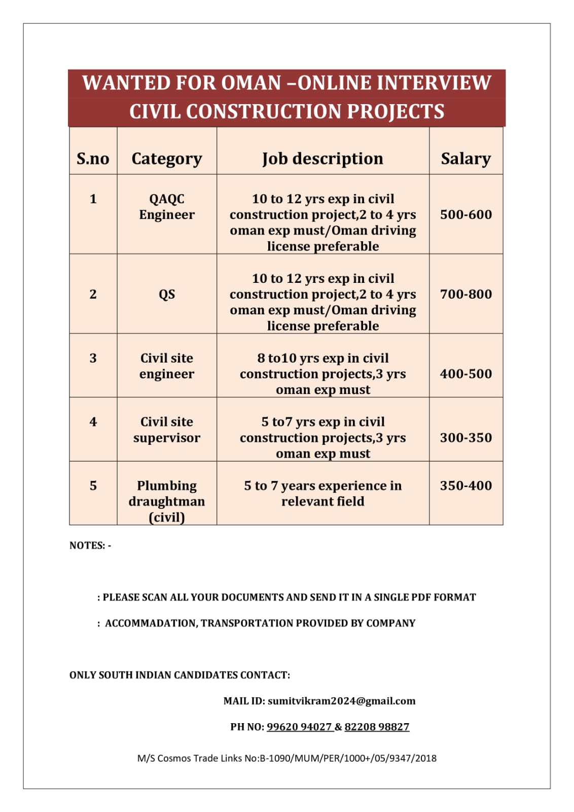 Jobs in oman for indians for QA/QC Engineer, QS, Civil site engineer, civil site supervisor, Plumbing draughtsman send your cv to sumitvikram2024@gmail.com or contact: 9962094027