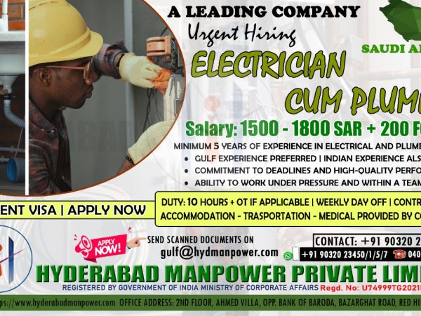 Must have Experience upto 5 years in Electrician and Plumbing Work Indian Experience also Accepted