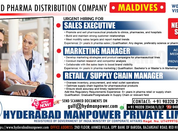 Hyderabad Manpower Private LimitedSeptember 25, 2025September 25, 2025Urgent Hiring for A Reputed Pharma Distribution Company of Maldives Must have Experience in relevant field Share
