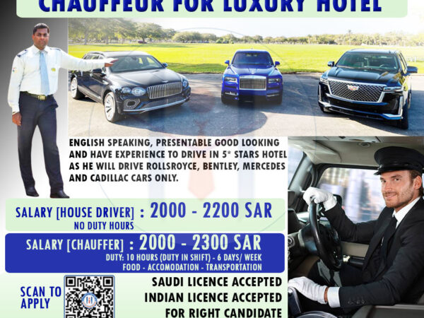 English Speaking Presentable Good Looking and Experience to Driver in 5 Star Hotel as Well Driver RollsRoyec, Bentlry ectt…..