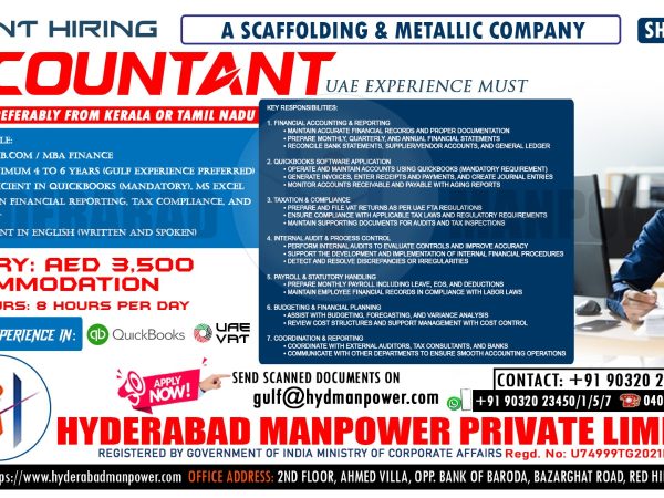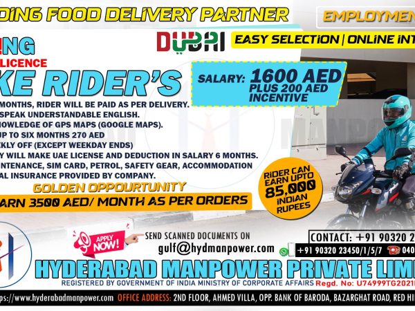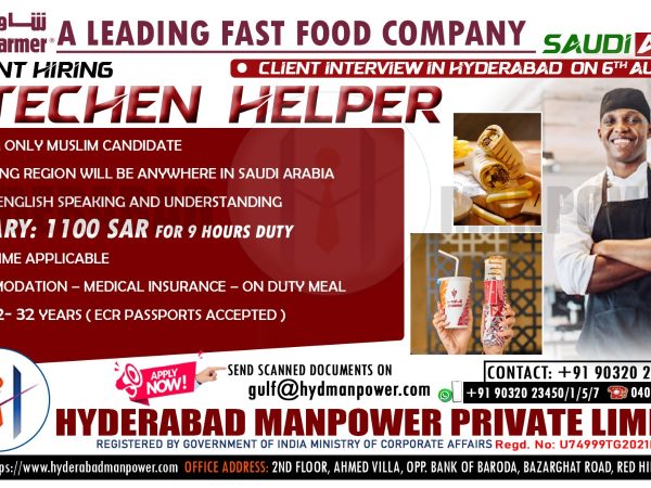 Free Food, Accommodation, Transportation and Medical Insurance Contact now Email: gulf@hydmanpower.com | +91 90320 23453