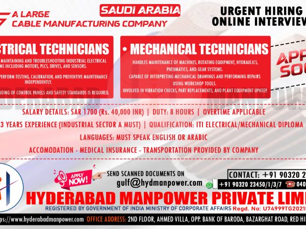 Urgent Hiring for A Cable Manufacturing Company in Saudi Arabia