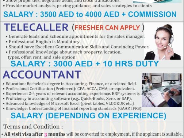 1 Property consultant 2 tele caller 3 accountant salary depends on interview