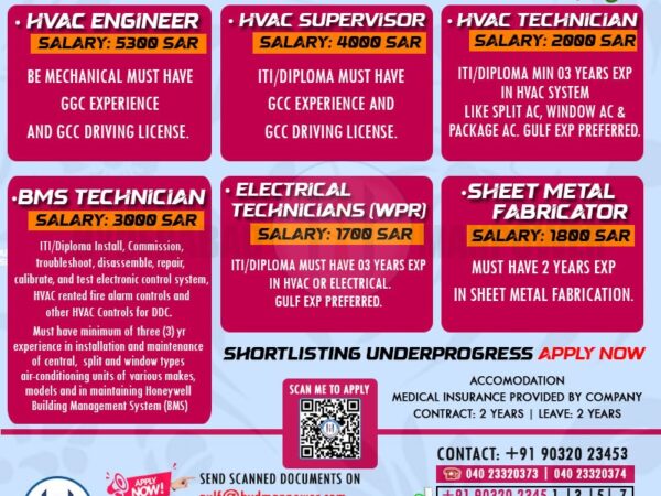 Must hold ITI/Diploma with Gulf Experience in same Field must have Experience in Facility maintenance
