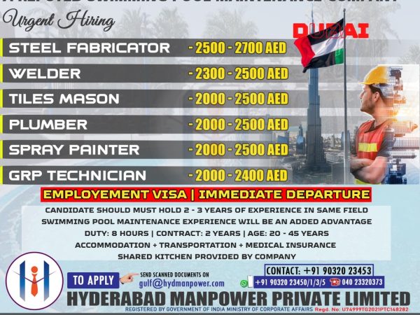 Candidates Must hold 2-3 years Experience in Same Field Swimming Pool Maintenance Experience will be added Advantage