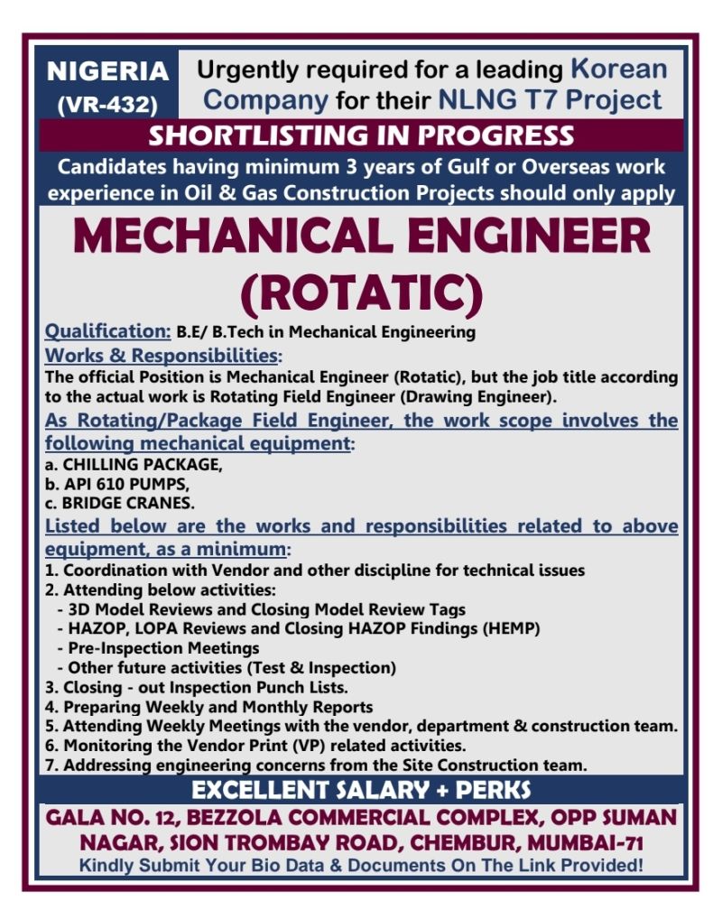 Nigeria Job for Mechanical Engineer in Asiapower office mumbai requirement for korean company shortlisting in progress