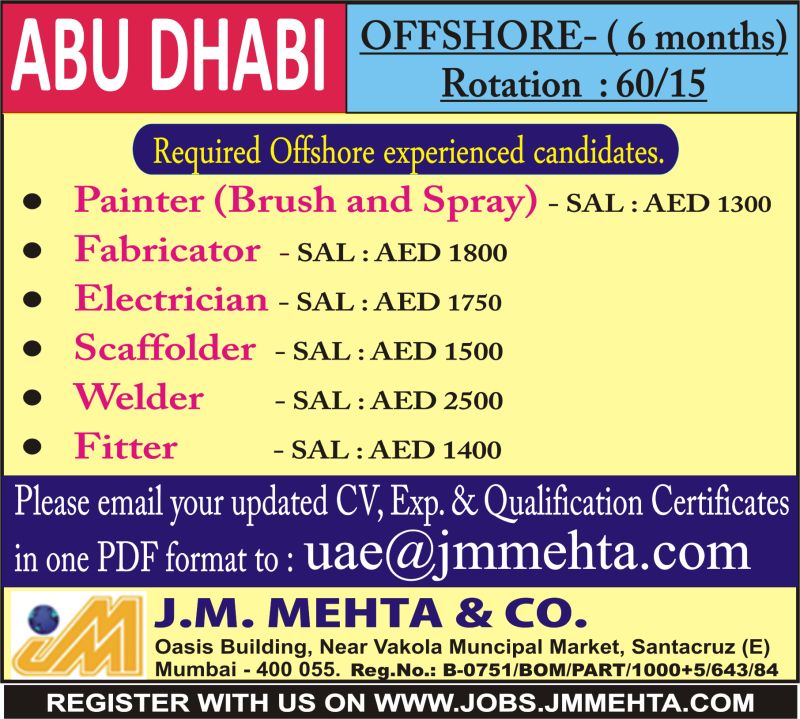 Offshore job vacancies in Abu Dhabi for Indian in JM mehta office in Mumbai Requirement for painter brush and spray fabricator electrician scaffolder welder fitter send your cv to uae@jmmehta.com