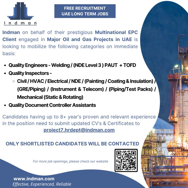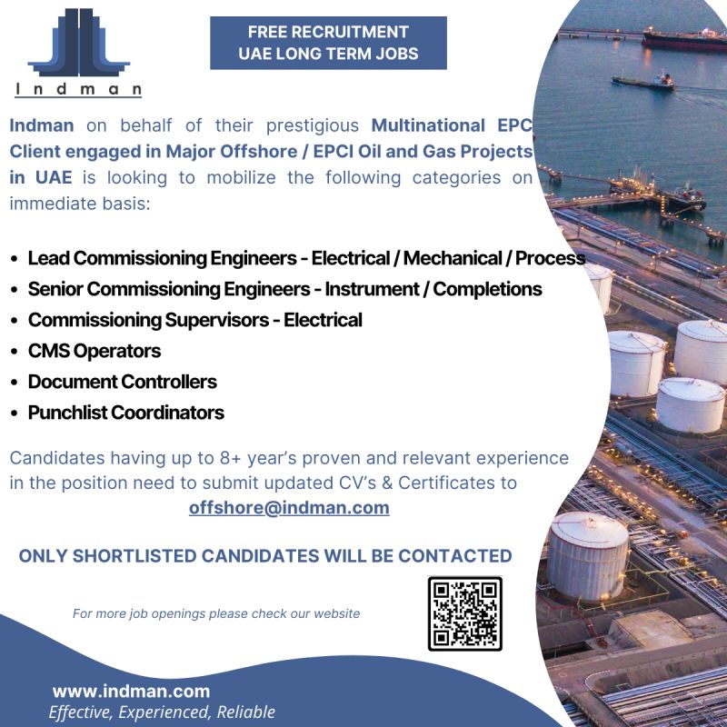 Offshore Job Vacancy for UAE Free Requirement for Document controller punch list coordinator CMS Operator Commissioning supervisor electrical instrument engineer mechanical electrical engineer send your cv to offshore@indman.com