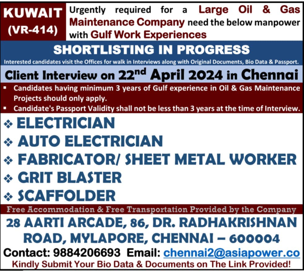 Oil and gas jobs in Kuwait for Indians for Electricians, Auto Electricians, Fabricators sheet metal worker, Grit blaster, Scaffolder send your cv to chennai2@asiapower.co contact: 9884206693