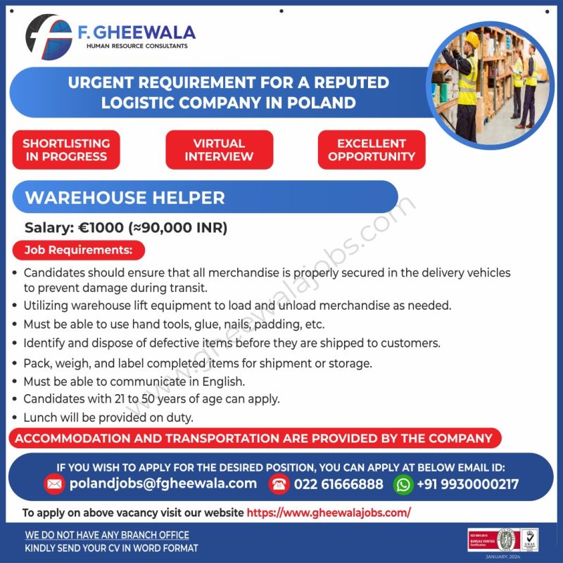 Poland Job Vacancy for Warehouse Worker in F Gheewala office Mumbai required for logistic reputed logistic company shortlisting in progress virtual interview.