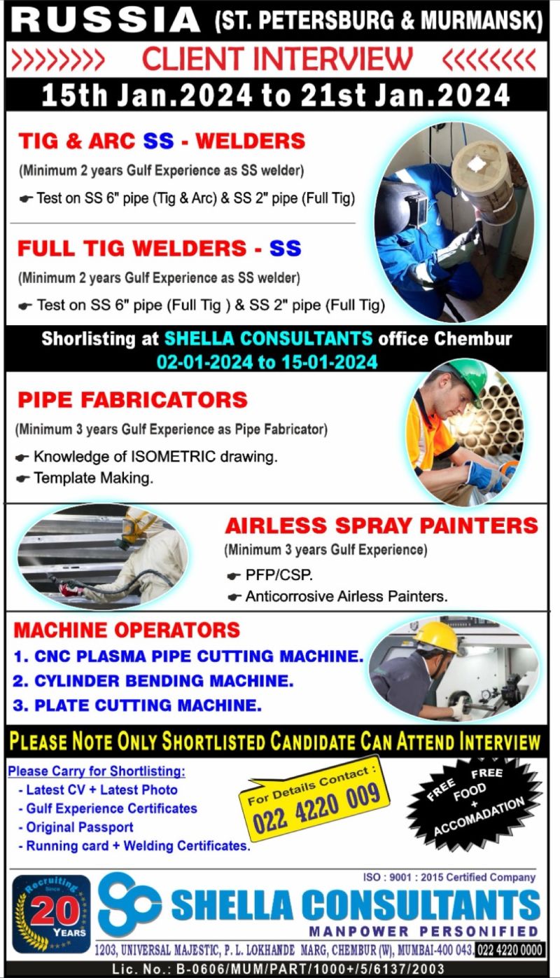 Europe JobRussia Job St Petersburg and Murmansk Client Interview Russia Job St Petersburg and Murmansk Client Interview for welder pipe fabricator painters Share