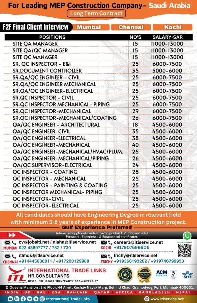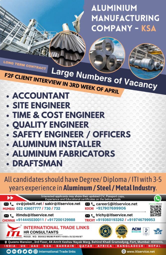 Site Engineer Jobs in Saudi Arabia for Aluminum manufacturing company large number of vacancy long term contract F2F client interview in 3rd week of April in Trade Link International (ITL) office send your cv to cv@jobsitl.net Post by abroad vacancy