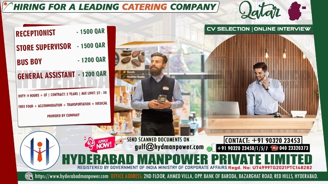 Gulf JobUrgent Hiring for A Leading Catering Company of Qatar Free Food – Accommodation – Transportation and Medical Insurance 8 hours Duty + Over Time Share