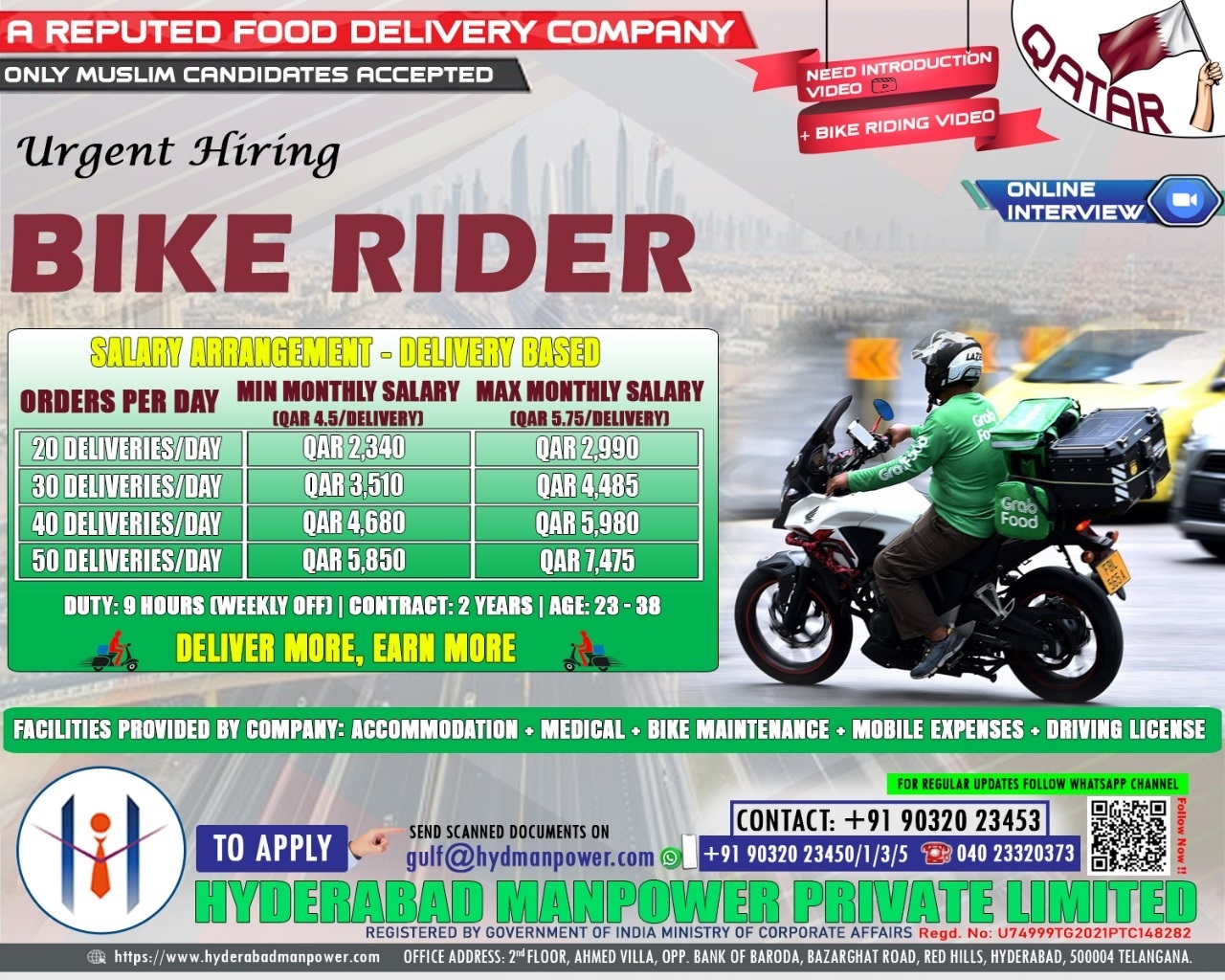 Gulf JobUrgent Hiring for A Reputed Food Delivery Company of Qatar Indian license accepted | need Introduction Video Share