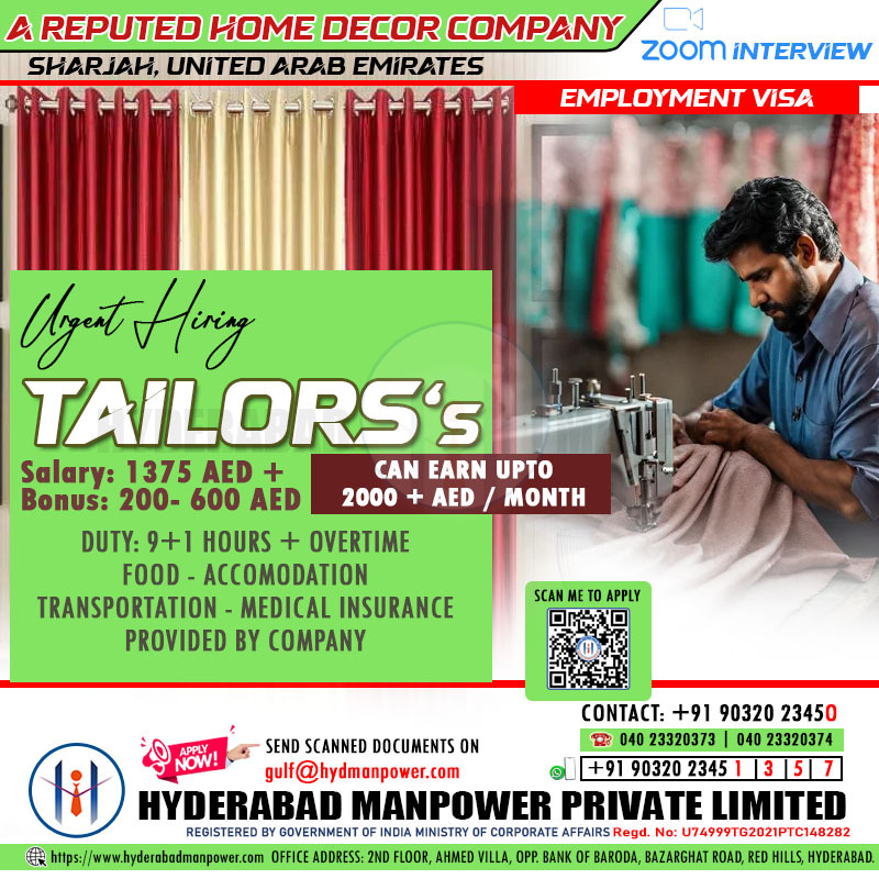 Gulf JobUrgent Hiring for A Reputed Home Decor Company – UAE Must have Experience in Tailoring Free Food, Accommodation, Transportation & Medical Share