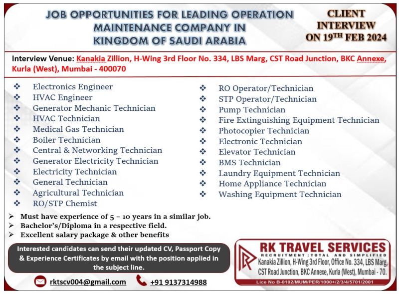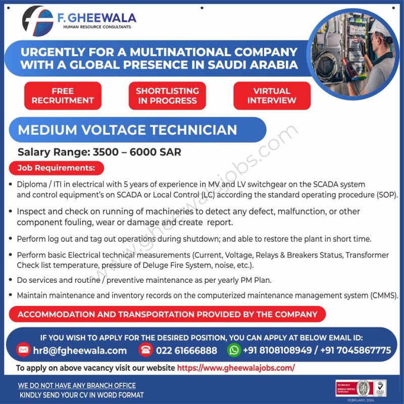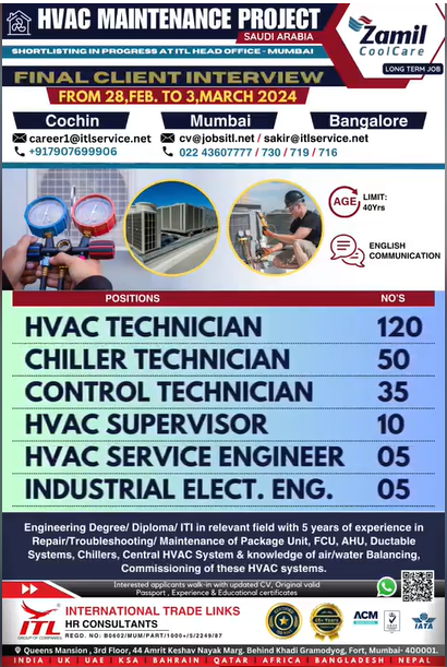 Zamil Coolcare Company Job Vacancy for Saudi Arabia for HVAC Technician Chiller technician control technician hvac supervisor hvac service engineer industrial electrical engineer for HVAC Maintenance projects vacancy in ITL office.